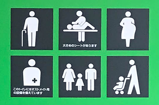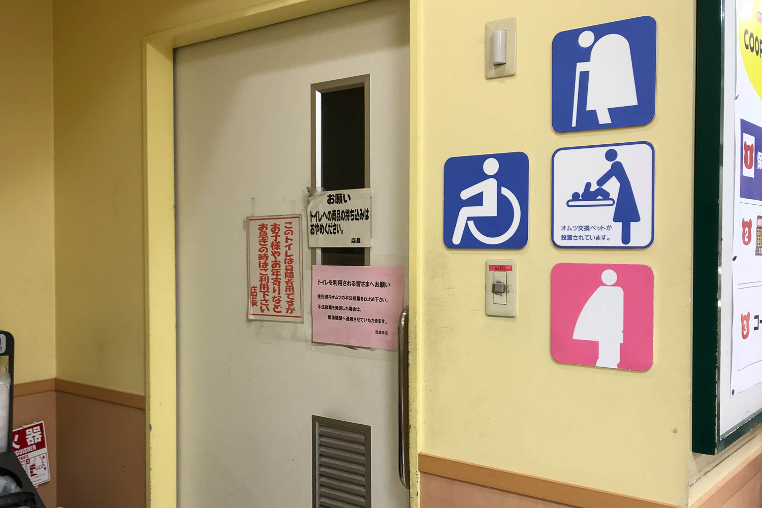 ●1階多目的トイレにオムツ替えシートあり。2階に男女トイレ。女性トイレにはベビーチェアと男児用小便器あり。