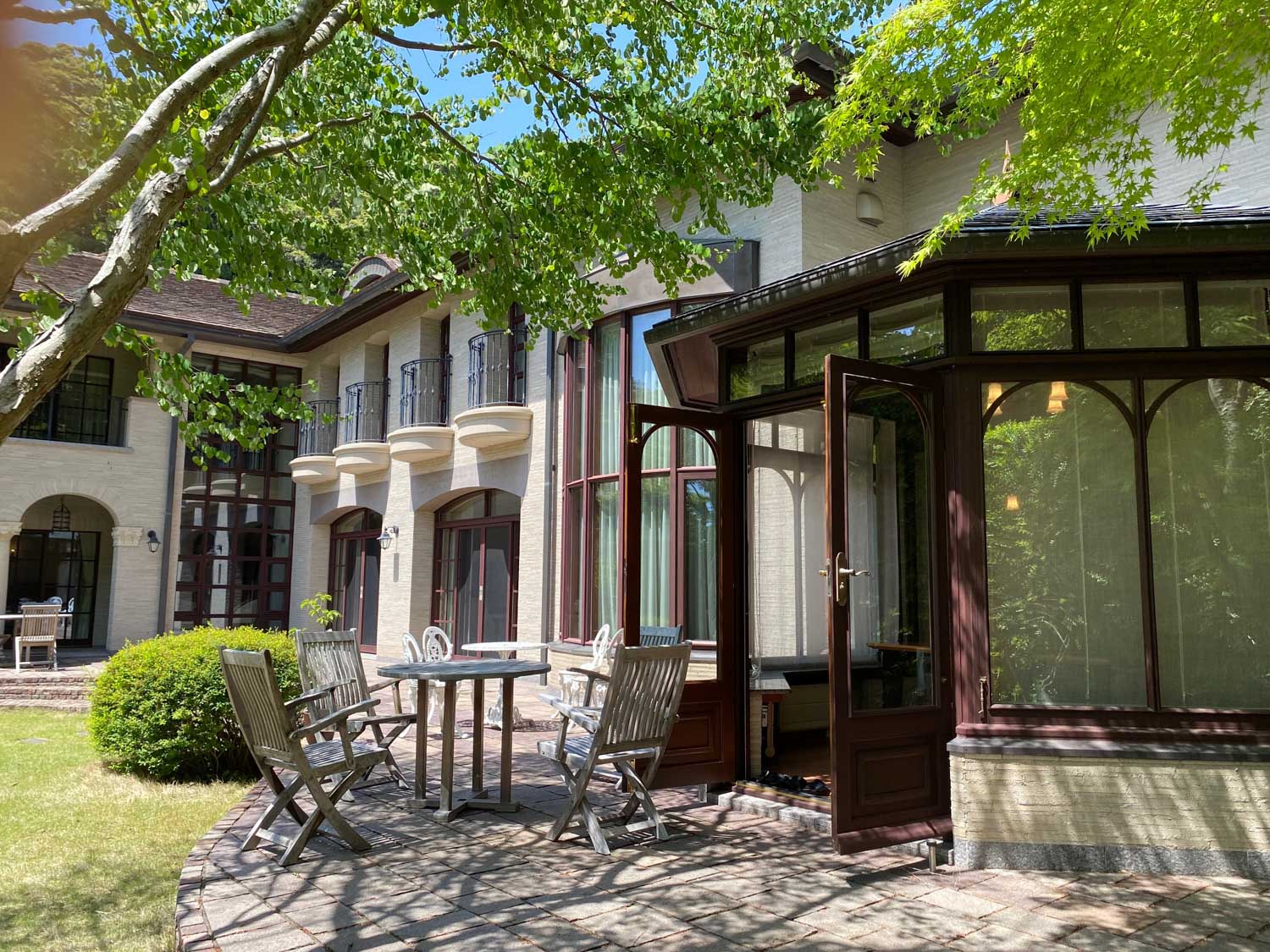 鎌倉駅から徒歩6分ほどの扇ガ谷の豊かな緑を抱く静かな山の手に建つ、広大で瀟洒な邸宅。「鎌倉 無有館」と名付けられたこの建物は、広々とした庭と品の良い洋風の外観を備えています。