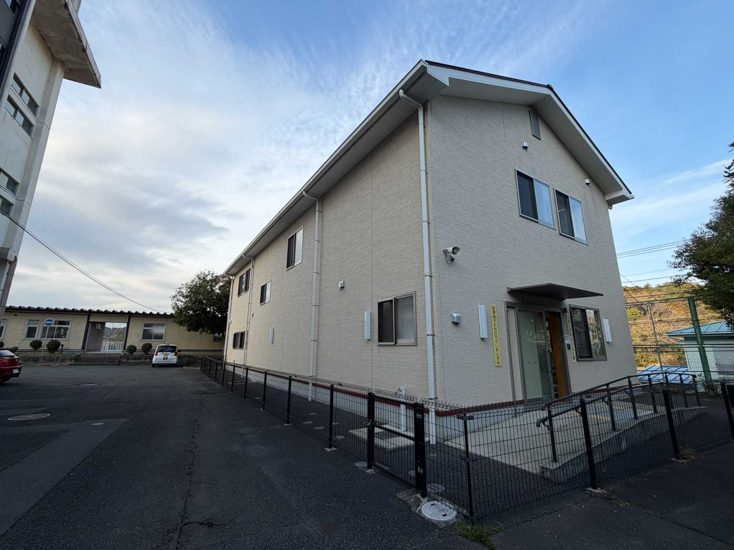今泉小学校の学童保育施設。学校敷地内、北棟昇降口の前にある2階建て。正門の方から、職員駐車場の後ろ側の細い通路を通って入る。