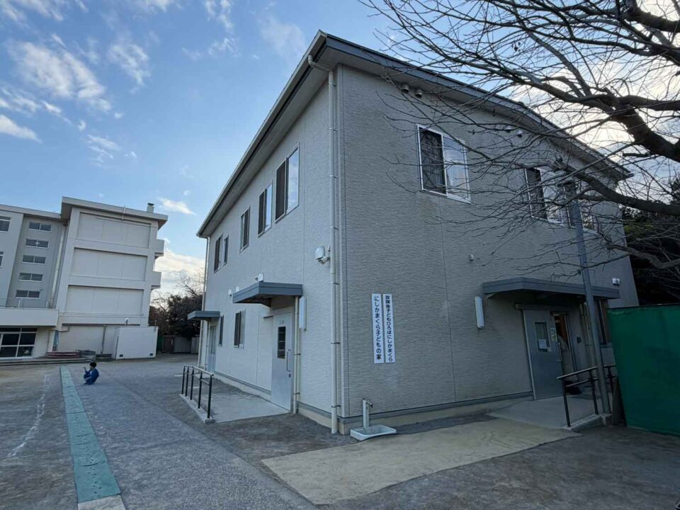 西鎌倉小学校の学童保育施設。校庭の隅に2017年新築した2階建ての建物で、外トイレを併設。外から行くときは、バス停「西ヶ谷」から階段を上がって校庭側の校門を入ってすぐ。