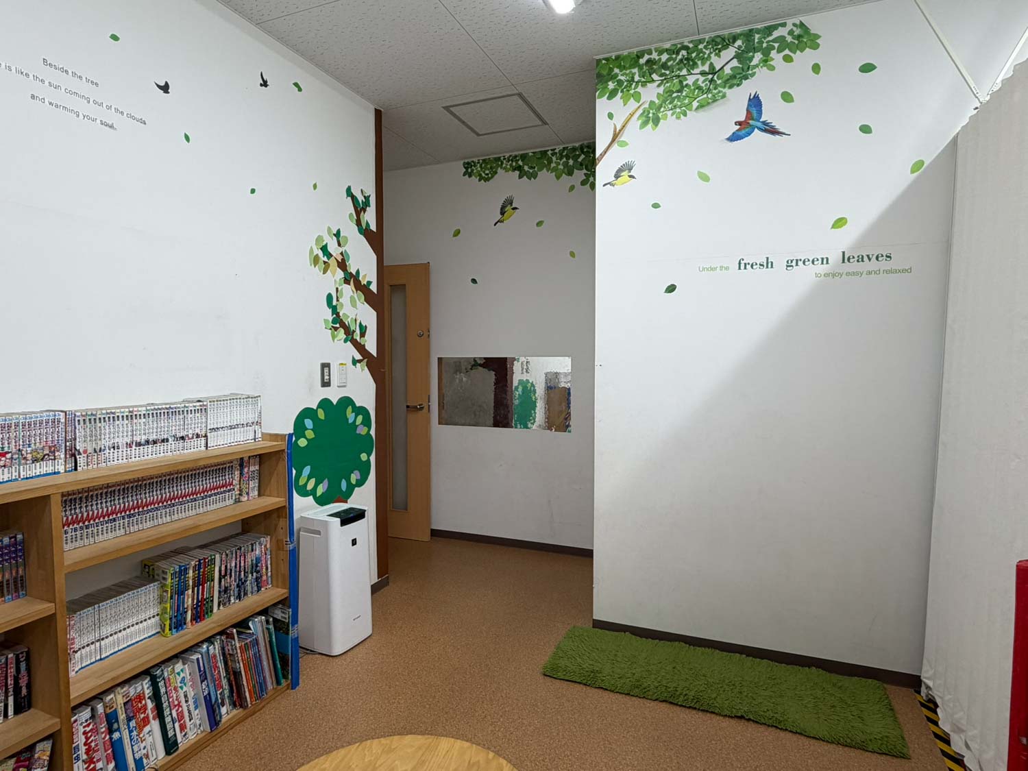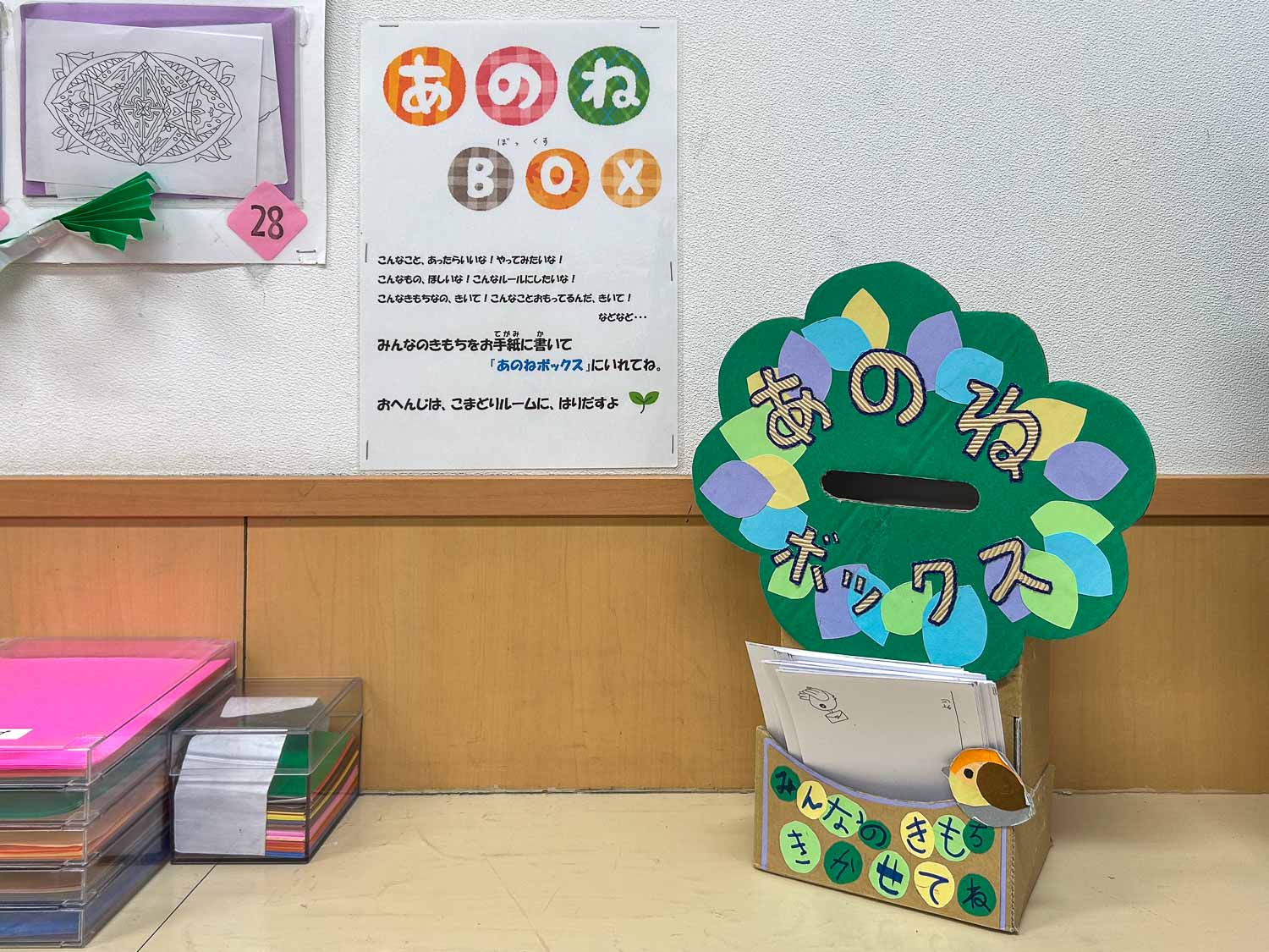 1階にあるこまどりルームでは、工作など申込不要のプログラムを行っている。子どもが相談ごとや意見を投稿できる「あのねボックス」を設置、誰が書いたかわからないように指導員が投稿内容と回答を書き出して掲示している。