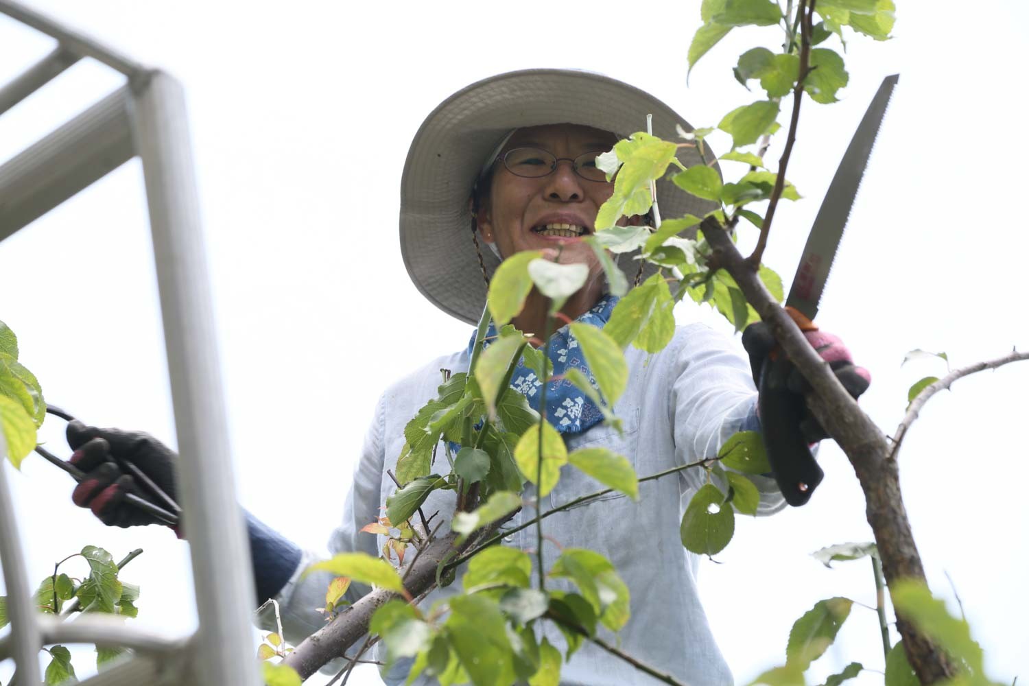 梅雨の合間の曇りの日、その植木屋さん、遊木苑・徳元さんはお手伝いの吉田さんと一緒にやってきました。中肉中背の普通の女性です。徳元さんは手がかかる梅の木から、吉田さんは庭の雑草の処理から始めます。「とげ」がチクチクして素人にとっては手ごわい梅。剪定のため大きな脚立に上って様々な角度から切っています。想像以上の作業ですが、軽やかにこなしています。