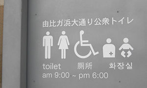 07年5月、由比ガ浜大通りに面した新築ビルの1Fに、市民や観光客が使える公衆トイレが誕生。車いすでも使える多目的トイレ内に、オムツ替えができる多目的シートやオストメイト対応トイレが設置されています。女性用トイレにもベビーチェアが。