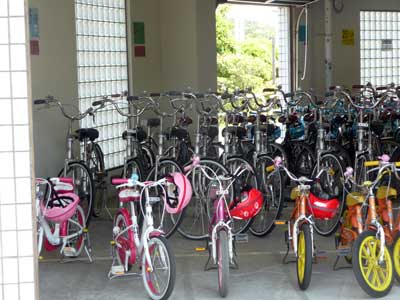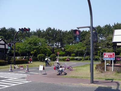 交通公園内は個人の自転車持ち込み禁止。さまざまなサイズの自転車が借りられる。子供用にはヘルメット付き。サイクリングコースには信号や横断歩道があり、走りながら交通ルールが学べる。