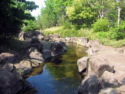 池の水は「渓流広場」を通って、魚のいる「ドジョウの池」に続く。「渓流広場」は浅い流れだが、あまりきれいではないので水遊びはやめた方がよさそう。ザリガニもいるらしい。うっそうと木が茂る「ドジョウの池」周囲は立入禁止。カモがのんびり泳いでいた。