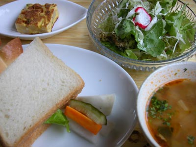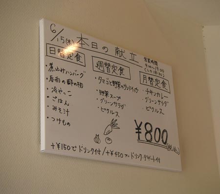若宮大路沿い、東急の駐車場脇にH18年6月にオープンしたカフェ。日替り、週替り、月替り、の3種の定食が800円で食べられます。ハンバーグ定食、カレー、サンドイッチなど、家庭料理のようなやさしい味付けなので家族連れにも◎。売り切れなければ、夜ご飯まで同じメニューというのも嬉しい。600 円で「今日のお弁当」がテイクアウトもできます(11時〜)。デザート類もおいしいので、カフェとしての利用もおすすめ。ビールも有り!