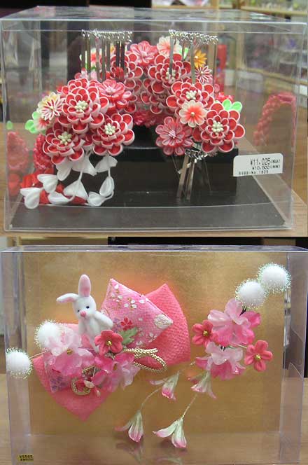 品揃えはなかなか。七五三用でも1万円を超すゴージャスなタイプから、三歳児用のボンボンのようなアクセサリーまでよりどりみどり。お母さんの正装用のかんざしも揃います。かんざしは自社工場で作った商品を売っているので、お値段も比較的お手頃かも。
