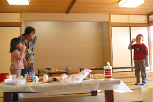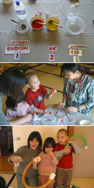 子供達は実験に夢中、お母さんはお茶を飲みながら、