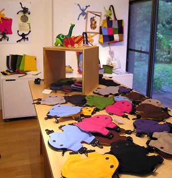 ここは07年春にオープンした『9brand』。「生き物」をモチーフに、かばん、おもちゃ、雑貨などをデザインし、商品化しているレーベルのショップです。例のカエルたちは、実はケイタイやカメラをすっぽり飲み込むポーチ(3780円〜)。他にも、たたまれた状態ではサナギに、広げると蝶のように変身する帽子(写真左上:大7140円、小6090円)や、ヤモリ型のマグネット(2940円)、小さい子が自由にボタンをくっつけたりはずしたりして変身させられるヌイグルミ(写真右下:1890円)など、つい手にとって試したくなるオリジナルのグッズが並んでいます。また9brandがセレクトした「生き物」にまつわる全国の郷土玩具の数々も置いてあるなど、まるで小さな博物館。9brandが提唱する、生き物たちの不思議な生命力を感じ取れる空間です。