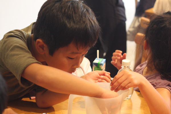 ???の科学タネ明かしの後は作り方の手順を聞き、制作開始。製作中の参加者はかなり真剣。しょうゆケースが水面すれすれで浮かぶように、中に入れる水の量を調節するのがむつかしいのです。