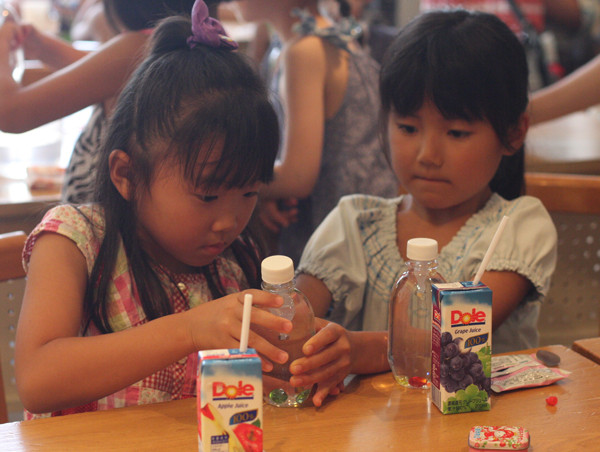 さて、ジュースを飲んで一服したところで、今度は自分たちで工作です。夏らしく浮沈子(ふちんし)。水が入ったペットボトルの中の魚(しょうゆケース)を、先生が自在に浮いたり沈んだりさせます。