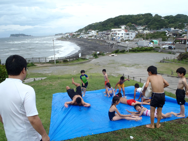 江ノ電に乗って稲村ガ崎公園に行ったら芝生スキー開始。芝生の生える斜面にブルーシートを引いて水をかけて、滑り降り!! これはおとなも子どもも声をあげるほど楽しくって、しかもドロドロになっちゃいます。