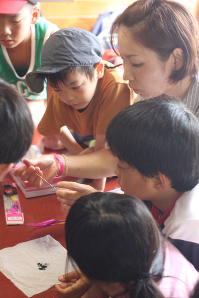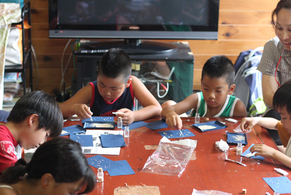 子どもたちがヤキソバをたらふく食べると、午後からは科学工作教室。まずは星の案内人・河合先生が指導する星砂の砂絵工作。お土産などで時々もらう星砂を惜しみなく使って、夜空を表す紺色の画用紙に描かれた星座の位置にボンドで貼り付けます。