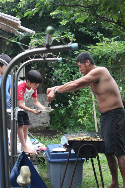 鎌倉太郎ハウスに戻ってシャワーを浴びた後、庭のBBQコンロを使ってヤキソバ。太郎の山田さんがマスターとして腕をふるうと、野菜をちぎったり、火を調節したり子どもたちがお手伝い。活動は一見アバウトにも見えますが、芝生スキーや子どもたちのシャワー、焼きそば調理にしても、実はていねいに準備したうえで熟練者が段取り良く進行し、要所をおさえながら子どもたちの出番を用意していることがうかがえます。