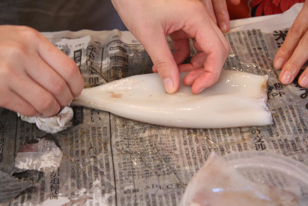 調理が進み野菜の下準備が済んだ頃、「今日はイカの皮むきをしましょう」と先生。「うわ〜、はじめて♪」「この機会に覚えちゃおう」と、はじけるような声が聞こえます。宮本先生のご指導もあってか、皆さん初めてなのに手際もいいようです。