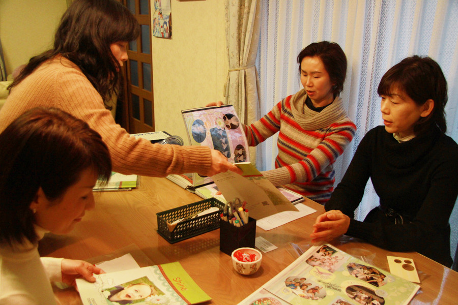この日は先生のお宅で4名の生徒さんがそれぞれが整理する写真をもってきて自分のアルバムを作る作業をしていました。時に参加者同士で話に花をさかせ、アドバイスを仰ぎ、見せあいながら各自のアルバムをつくる時間は、皆さん本当にやさしい顔をしています。「自宅でやることもできるのですが、新しい台紙類や豊富な専用ステーショナリが用意されていて、先生やお友だちと話をしながらアイディアをもらうワークショップの方が、豊かなアルバムができるんです」と参加者。