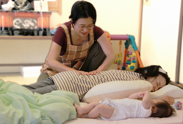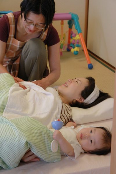 普段の様子や授乳時、散歩、お風呂の様子、生活のリズムなどをおかあさんと話しながら、宮崎さんの手は休むことなく動き、足腰、首、肩、乳房と体をほぐしていきます。宮崎さんの丹念なケアで硬くしこっていた乳房からおっぱいがぴゅーっと出るようになるころ、おかあさんの横の赤ちゃんはすやすやとお昼寝です。