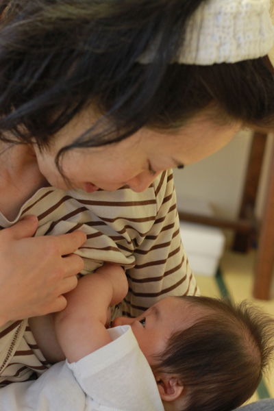 IMG_6498約1時間のケアの後、目覚めたゆう君は機嫌よくおっぱいの時間♪ 「ケアの後はすごく楽になって、こどももよく吸ってくれるんです」とおかあさん。宮崎さんは古くからの友人のように親子の様子をにこにこ見守っています。