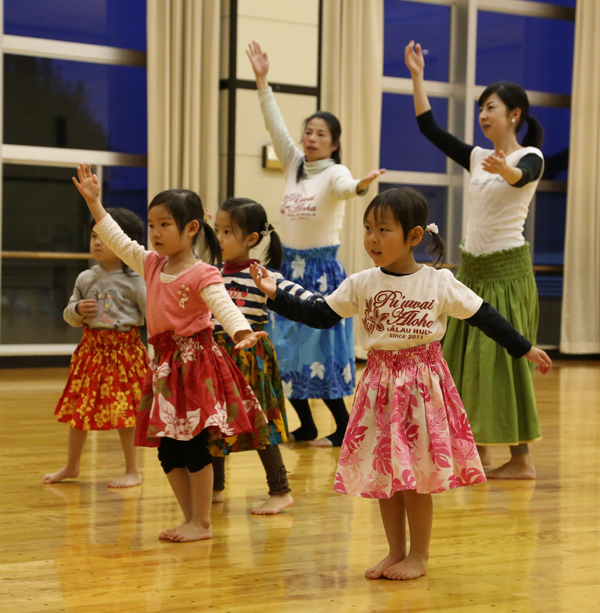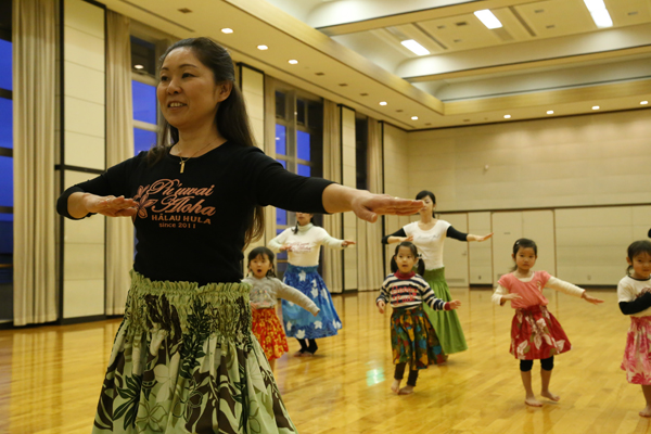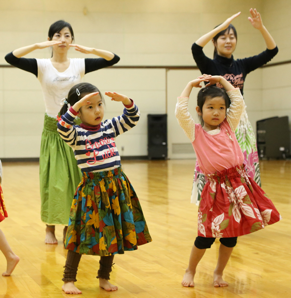 水曜の夕方、武道館でママと子どものフラダンス・レッスンが開かれています。中村智子先生のフラの教室です。