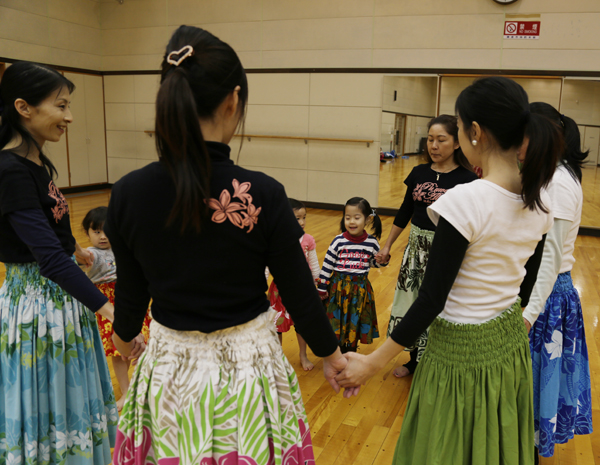 今回取材したのは教室の中でもサークル的な、親子向けのオハナクラス。レッスンは「ケガなく無事に踊れるように」との輪になってのお祈りから始まり、ストレッチを経て、いよいよダンスです。フラスカートをつけた女の子やおそろいのTシャツ+スカートのママが2列になって踊りだします。ママたちのそろったじょうずさ、女の子たちのノリノリのおしゃまさが、見ていて楽しい。