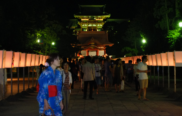 とりたてて屋台が出たり、派手な音曲やイベントがあるわけではありません。普段から鎌倉の夜は飲食店も少なくて人通りもまばら。けれども、避暑地にもなる鎌倉の、都心よりは少し涼しいこの時期の日没、ぼんぼりのほのかな光に照らし出された鶴岡八幡宮と鎌倉の夏の夜は、それはそれは幻想的で美しく、それを楽しみに住人も観光客も相応に訪れます。夜の催しだから押し合いへしあいしてしまえば、足元が暗くてキケン。そんなこともあってか皆、同じようなペースでおだやかに散策しているようです。ゆったりした夏の夜の涼を感じられて、このまちに住めて良かったと素直に思えます。