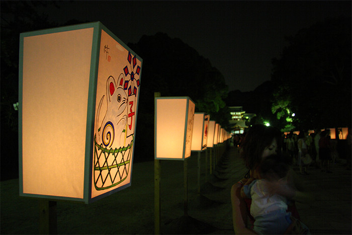 立秋の前日から8月9日までの数日間、鎌倉の鶴岡八幡宮の参道で夕方から明かりをともしたぼんぼりが飾られるのです。昭和13年、鎌倉在住の文筆家(当時の鎌倉ペンクラブ会長)・久米正雄の声かけで始まり、文化人らが書や画を揮毫したぼんぼりを出しました。毎年、文化人たちが新たに揮毫した約400点のぼんぼりが配置され、夕暮れになると巫女や神職がぼんぼりの一点一点にろうそくを立てていきます。雨が降ればぼんぼりはしまわれ、火が消えれば新しいろうそくに変えられ、八幡宮の人々に丁寧に飾り守られたぼんぼりたちが輝くのです。この期間は、八幡宮自身も夏越祭(夏の邪気を払う神事。茅の輪くぐりを行う)、立秋祭(実りの秋を願う祭り)、実朝祭(実朝の生誕を祝う)が行われます。