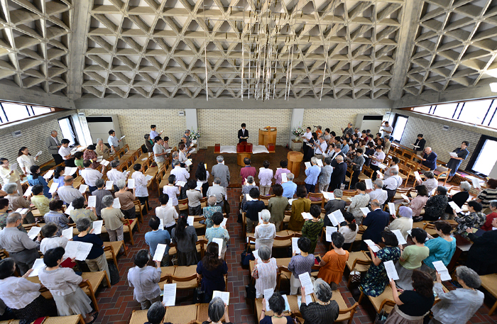 戦争直前の1941年、プロテスタント諸派が合同して日本基督教団を作り、日本基督教会もこれに参加します。同年、現在の場所(鎌倉市小町2丁目)に移りましたが、1945年終戦直前に強制疎開の命により教会を取り壊さなければならなくなりました。戦後同じ場所に新会堂を建設し、1984年に現在の会堂に建てかえ、今にいたります。現在は子育て世代の4人の牧師によって伝道が続けられています。