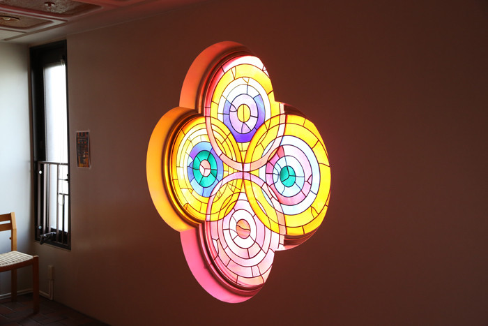 内部は礼拝堂を始め大小の集会室までタイルと木をふんだんに使い、場所によっては障子を配した、どこか和風で清楚なたたずまいです。ことに300人以上収容できる礼拝堂には3階部分に見事なパイプオルガンが設置されて、正面中央の一段高い木の床の上に木の説教台と机が配され、幾何学的な天井の模様は天窓まで続きます。色彩を押さえたタイルの壁と光の差しこむ窓からは、威圧するのではなく包み込む雰囲気が感じられます。パイプオルガンはオーストリアのマルティン・プリューガーの製作によるものだそうだです。