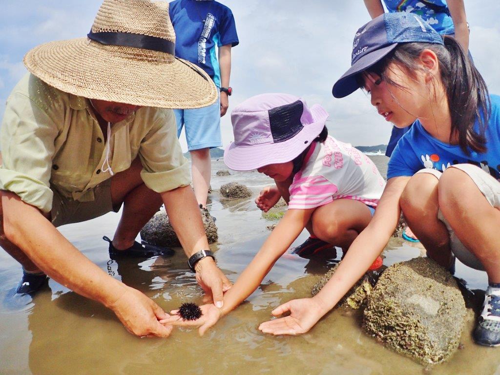 手のひらでウニ体験例えばウニ! 見た目はその針の山でさされそうに感じる。だが手のひらにのせると痛くない。子ども達は、それで刺されるわけでは無いことがわかった。手のひらのウニを、今度は海水の中に入れてみようと子ども達を誘う。しばらくじっとしていると・・・、子ども達の顔がほぐれてきた。ウニの体をよく観ると、棘の間から無数の足が出てきて手にひっつきだした。それが規則正しく動き始め、手のひらの上を歩き始めた。「くすぐったい!」子ども達は、これまで見たことのないウニの行動を知り、他にもへんてこりんな生き物がいるはずだと、さらに目を輝かせて磯の観察を再開した。