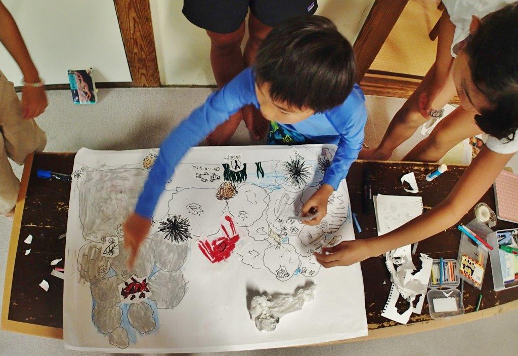 生き物をじっくり観察しメモル 昨日の体験とメモを元に、今度は、屋内の落ち着いた部屋の中でじっくり取り組むワークだ。模造紙に、海岸の岩の様子を描いて、そこへ磯の生き物を描き込んでゆく。昨日の出来事を、体験したことを形にしていくワークだ。