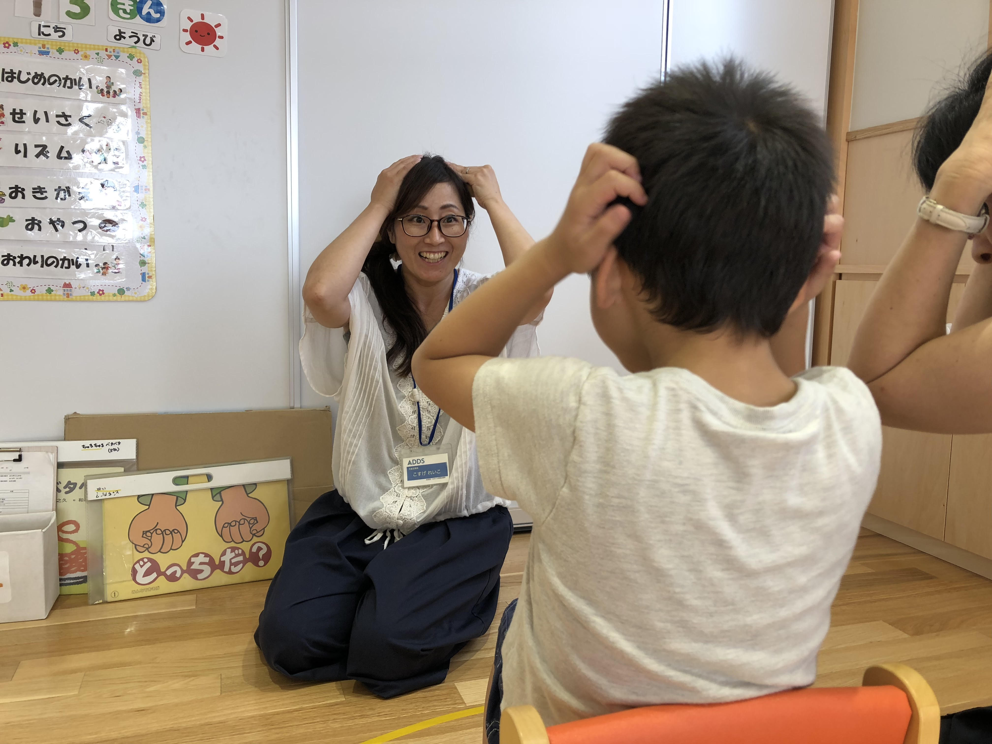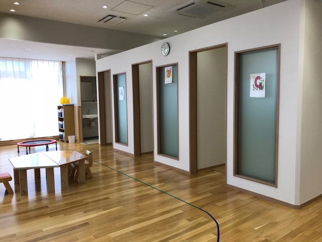 ここでは利用者の安全性の確保のため、建物内に入る際はインターフォンで対応してもらうことが必要です。エレベーターで3階へ。そこには障害児に対応したバリアフリーのフロアに、広いフローリングの活動スペースとかわいい椅子のある個室がいくつか。ADDSは、早期の療育の開始は児童の可能性を広げるという考えから、応用行動分析の研究成果に基づいた独自のプログラムをこちらで実施しています。児童発達支援として子どもの特性を把握して「できること」を増やしていくのです。