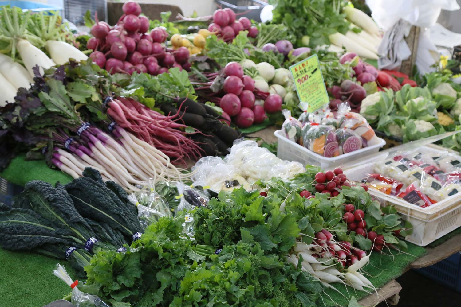 いささか年季の入った建物内で、簡易台の上にシートを引いて野菜を広げたちょっとそっけないブースがいくつも。でも新鮮さ、生産者の顔の見える安心感はいっぱい!なんです。