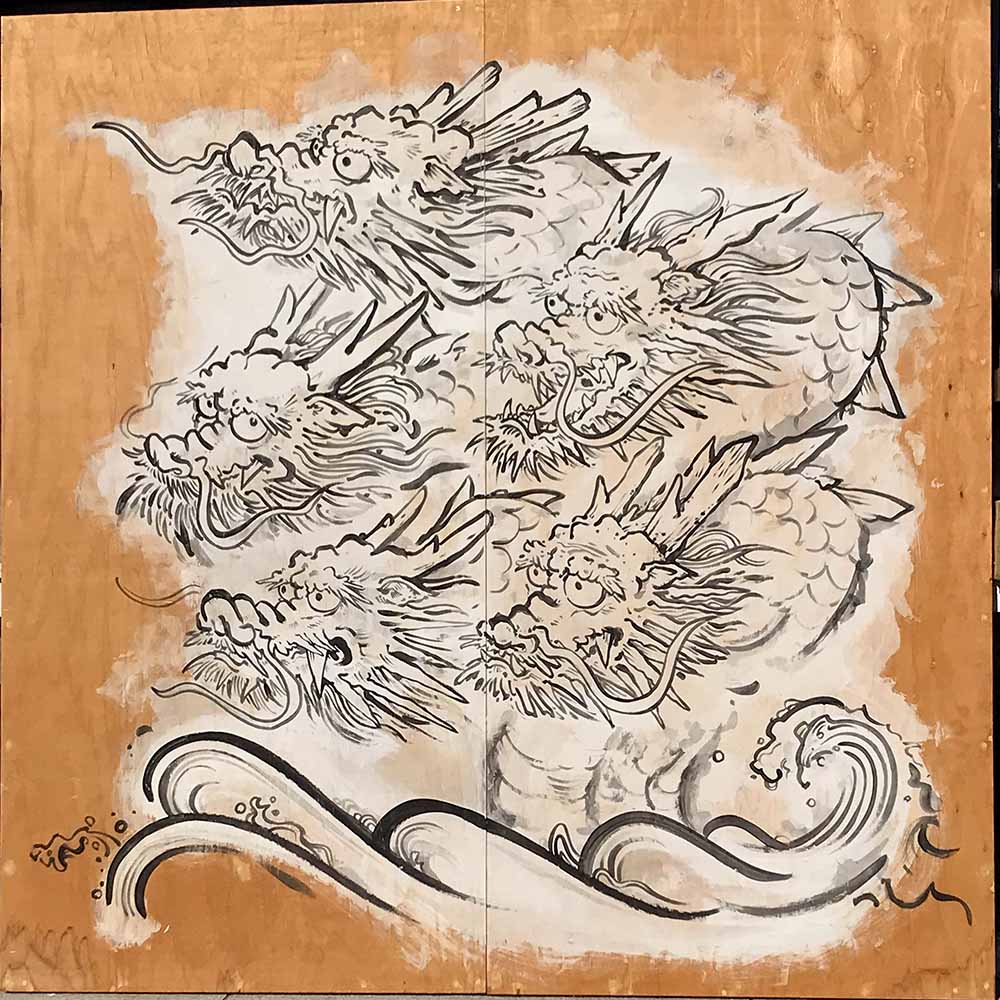一身五頭の悪龍が津村(腰越・津)の人々を苦しめていたが、江ノ島の弁財天に戒められて行いを改め、弁財天と契りを交わし、人々に尽くして国家安泰の神「五頭龍大神」となった、というお話です。江島縁起の物語でもあります。