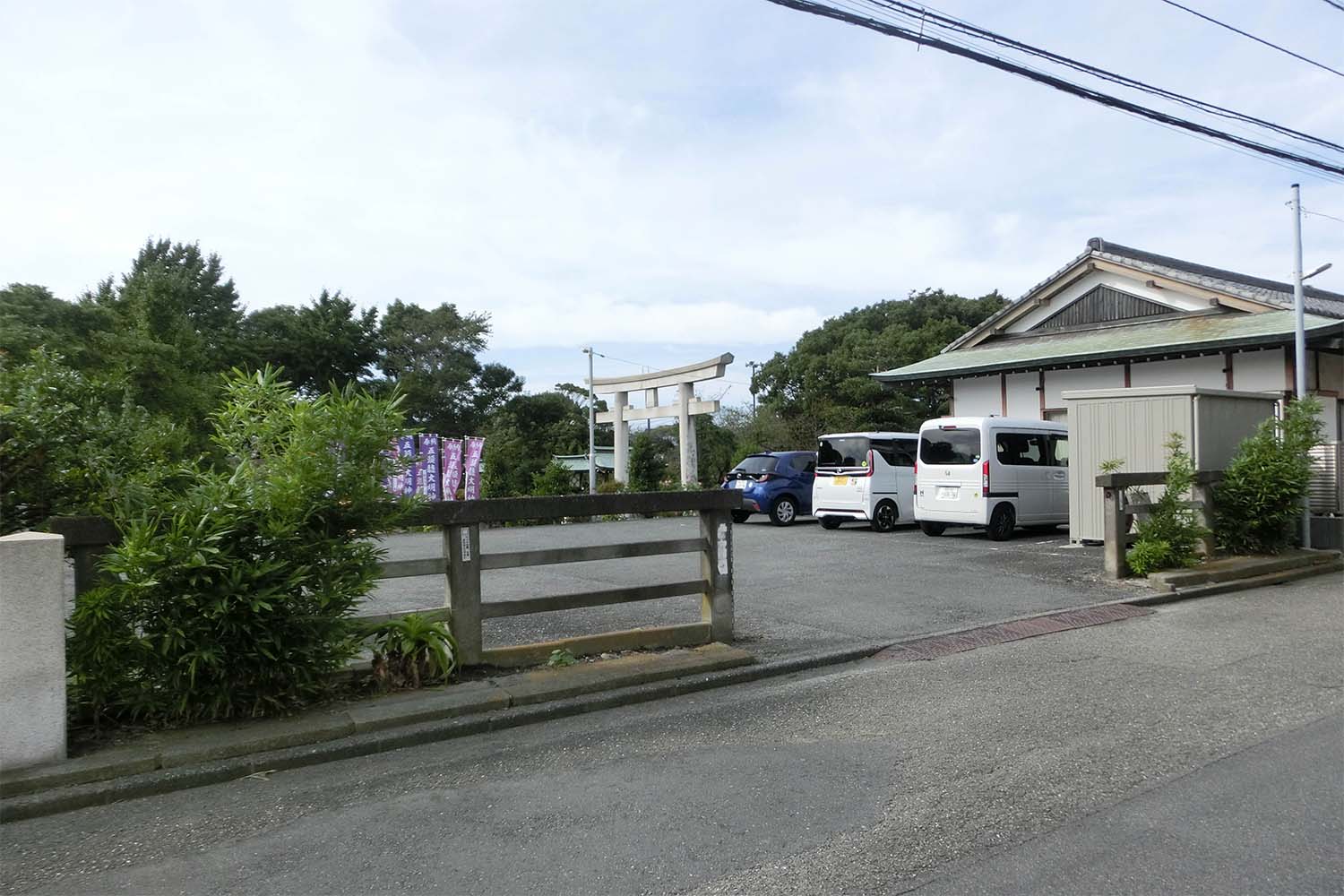 無料駐車場は約10台分。鳥居の前を通り過ぎ、神社に沿って角を曲がった先が入り口です。一つ手前のブロックにある大きめの駐車場は契約者用で、参拝客は利用できないので注意。