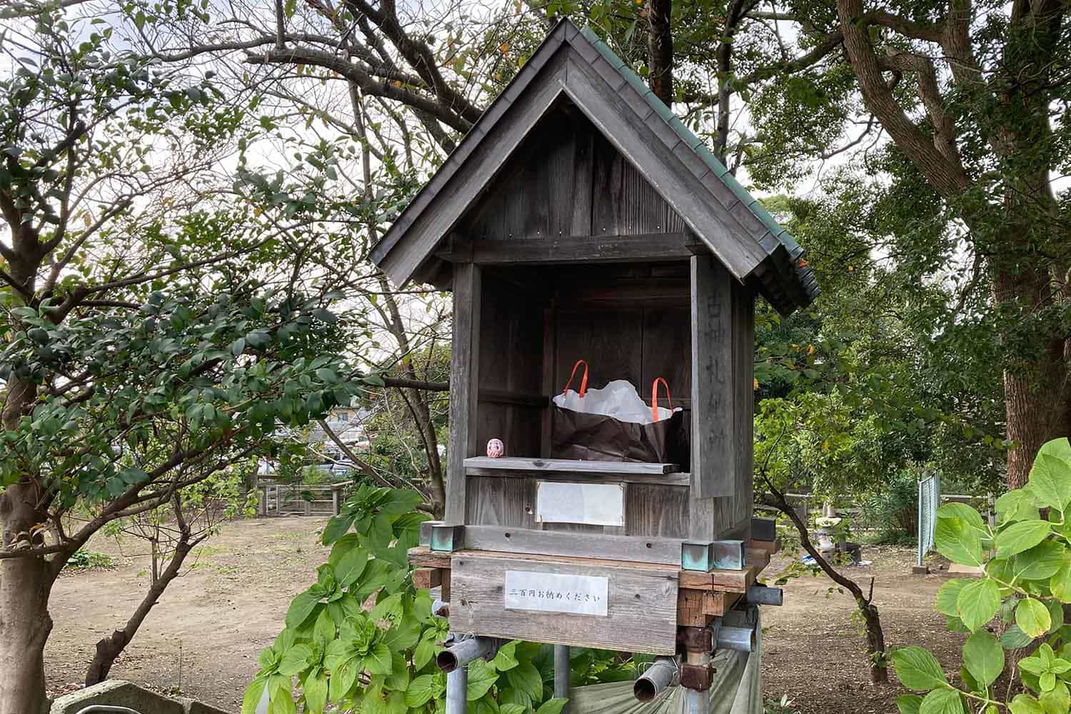 手水舎の少し先に、古いお守りや神札を返納する「古神札納所」があり、その脇から裏庭に下りられます。秋には裏の林で椎の実拾いも楽しめます。