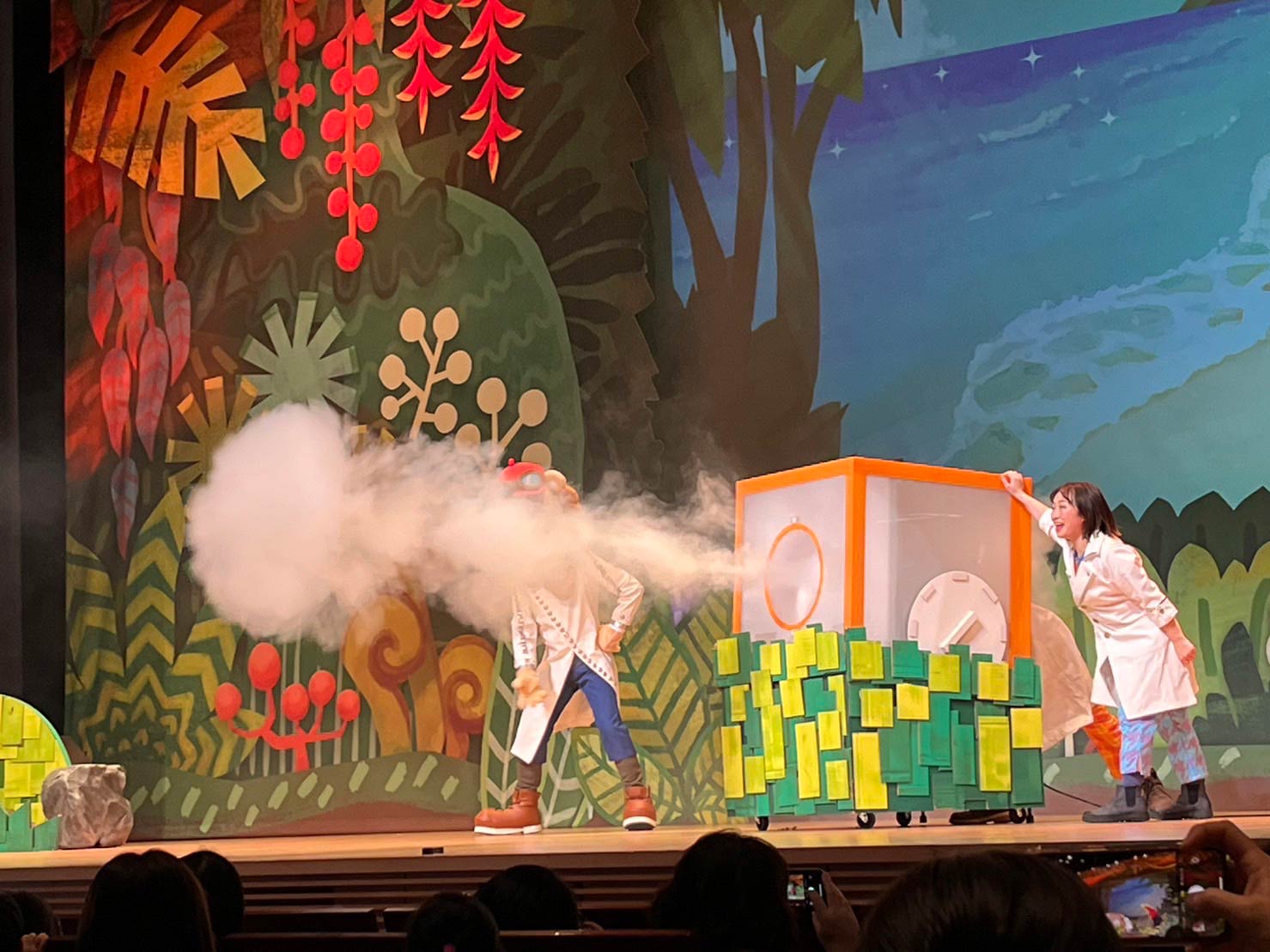 ショーの時間は1時間くらいでしたが、実験が子どもたちにもわかりやすい冒険ストーリーの中で展開される上、歌、ダンスと盛り沢山なのであっという間に感じました。