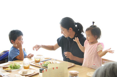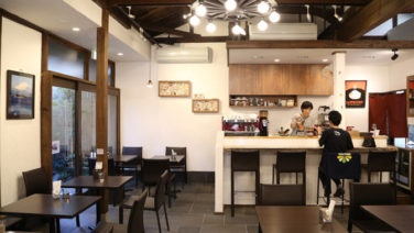 明るい室内にあるナチュラルウッドのテーブルで、引きたての薫り高いコーヒーやランチを楽しむお客さんたち。その中でママとキッズが楽しそう...