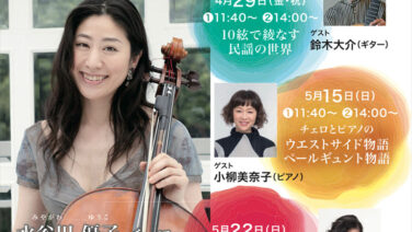 4月29日(祝・金)5月15日(日)22日(日)に、佐助にある笹野邸の『佐助サロン』で開催されるチェリスト 水谷川優子(みやがわ ゆ...